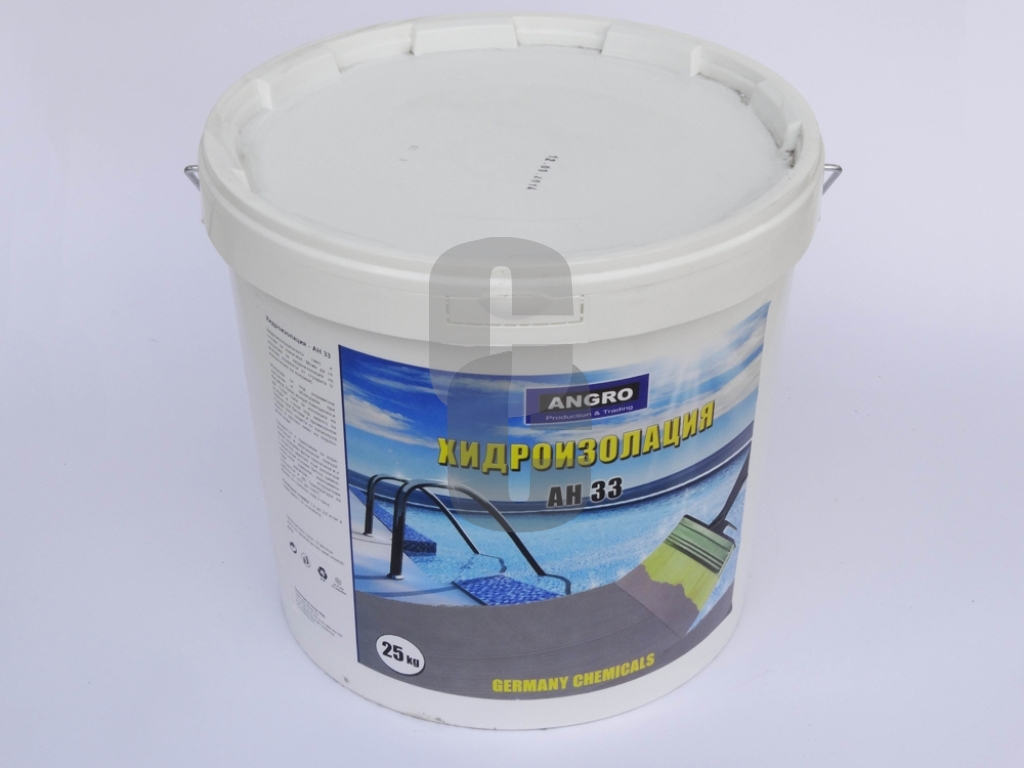 - АНГРО AN33 – 25 кг е готова за употреба течна хидроизолация, предназначена за защита на всички елементи на сградата (без покриви), които са изложени на влага, капилярни течове или високо ниво на подпочвени води.
