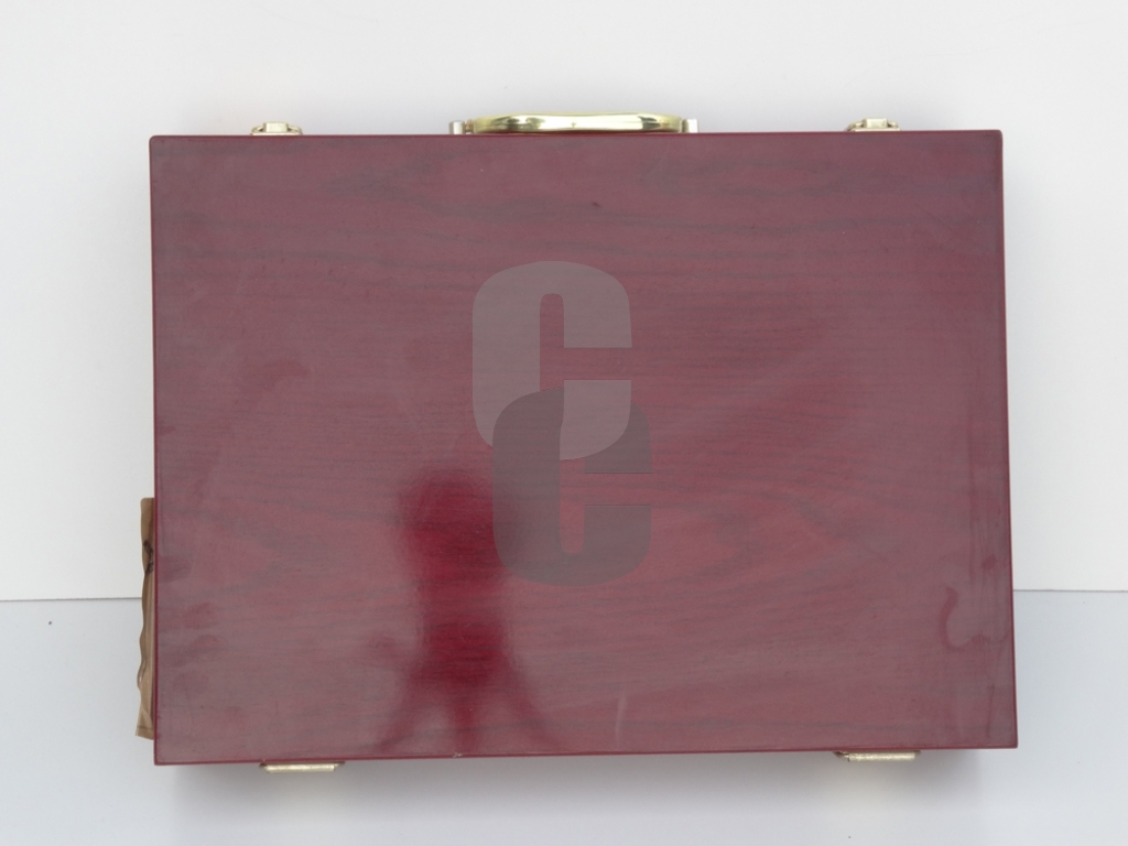 - Кутия: махагонова дървена кутия.